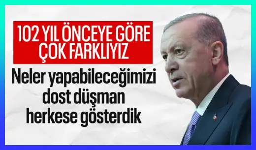 Allah’a şükür, bugün 102 yıl öncesine göre çok farklı bir noktadayız. Savunma sanayinden ekonomiye, ulaştırmadan eğitime, ticaretten sağlığa, dış politikaya, teknolojiye, turizme kadar her alanda geçmişle kıyas dahi yapılamayacak ölçüde büyük bir kalkınma seferberliği içindeyiz.