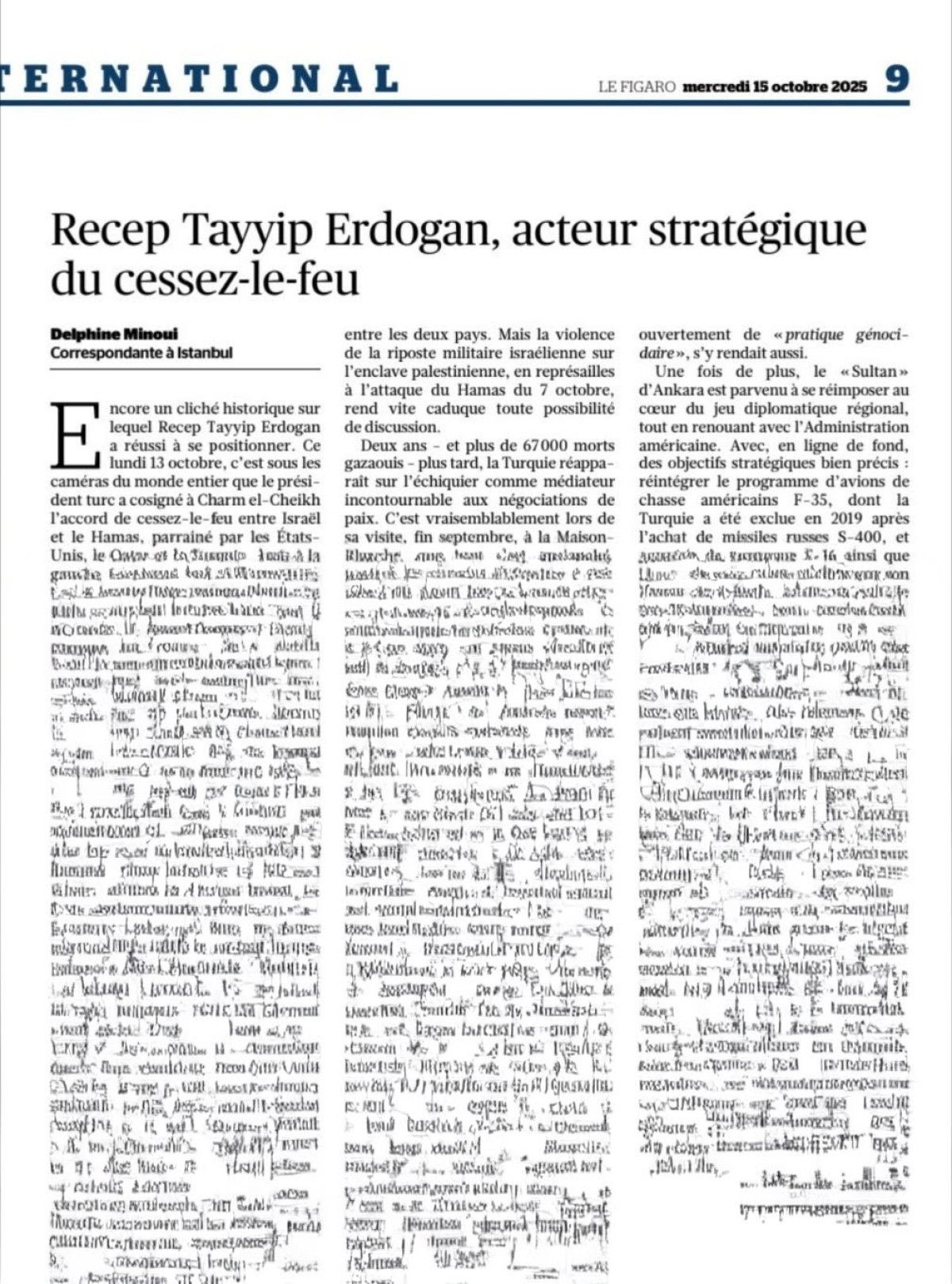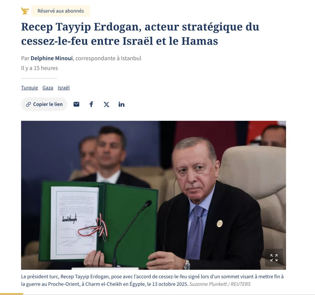 Mısır’da düzenlenen Gazze zirvesinde katılan Cumhurbaşkanı Erdoğan’ın sürece katkısı Batı medyasında geniş yer bulurken Fransız Le Figaro gazetesi “Ateşkesin stratejik aktörü Recep Tayyip Erdoğan” başlıklı bir makale yayınladı.