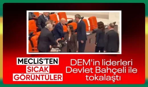 Genel kurul çalışmalarına katılan MHP Genel Başkanı Devlet Bahçeli, DEM Parti Eş Genel Başkanları Tülay Hatimoğulları Oruç ve Tuncer Bakırhan ile selamlaştı.