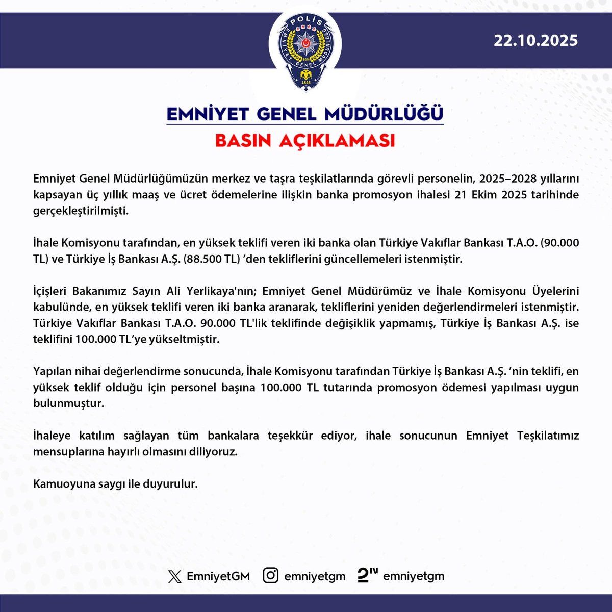 Emniyet Genel Müdürlüğü tarafından yapılan açıklamada 3 yıllık banka promosyon ihalesini Türkiye İş Bankası’nın kazandığını duyurulurken personel başına 100.000 TL promosyon verileceği açıklandı.