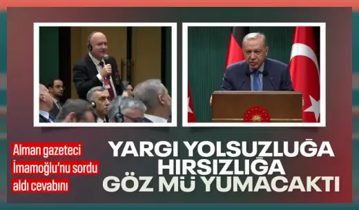Ortak basın toplantısında Alman bir gazetecinin ‘İBB’ sorusuna yanıt veren Cumhurbaşkanı Erdoğan, “Herhalde kim hangi makamda olursa olsun, bir hukuk devletinde hukuku ayaklar altına alamazsınız. Bütün bunlar olurken eli kolu bağlı olarak herhalde bir devlet bunu takip edemez” çıkışında bulundu.