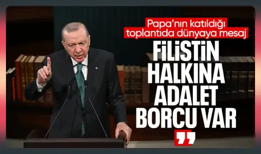 Türkiye’ye resmi ziyarette bulunan Papa 14’üncü Leo ile ortak basın toplantısında konuşan Cumhurbaşkanı Recep Tayyip Erdoğan, Filistin halkına en büyük borcun adalet olduğunu belirterek, “Bu borcu ödemenin yolu ise 1967 sınırları temelinde iki devletli çözüm vizyonunu bir an önce hayata geçirmektir.” dedi.