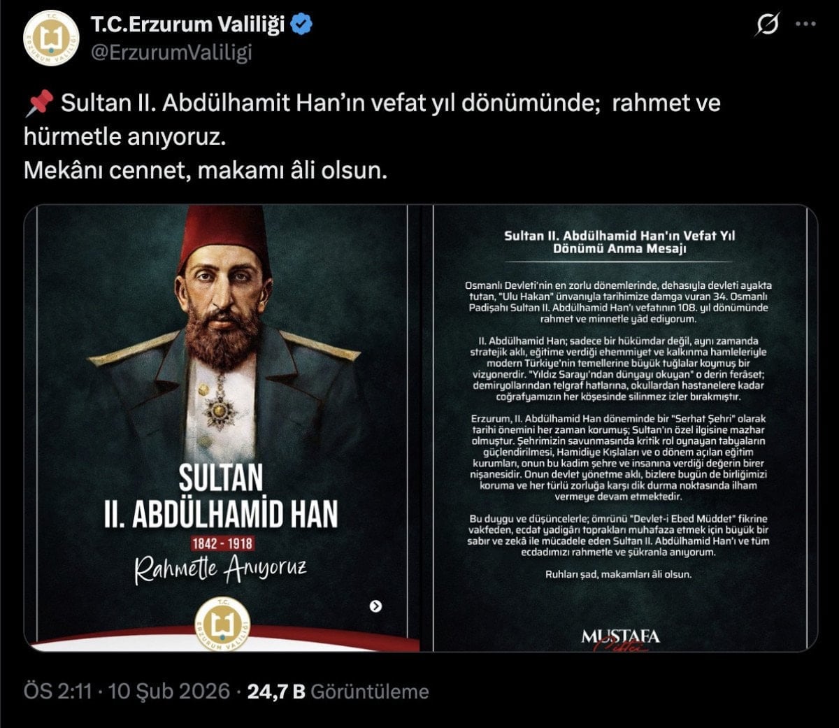 Yapılan paylaşımda “Sultan II. Abdülhamit Han’ın vefat yıl dönümünde; rahmet ve hürmetle anıyoruz. Mekânı cennet, makamı âli olsun.” ifadeleri kullanıldı.