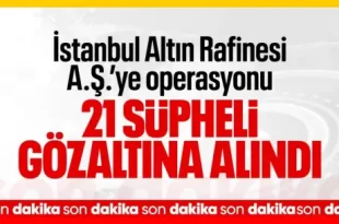 İstanbul Cumhuriyet Başsavcılığı, İstanbul Altın Rafinerisi A.Ş. ve bağlı şirketlerle ilgili soruşturma başlattı. Operasyonlarda 23 kişi hakkında gözaltı kararı verilirken, 21 şüpheli yakalandı. İstanbul Cumhuriyet Başsavcılığı koordinesinde İstanbul İl Jandarma Komutanlığı KOM Şube Müdürlüğü İstanbul Altın Rafinerisi A.Ş. ve bağlı şirketlere yönelik operasyon düzenledi. 21 KİŞİ GÖZALTINA ALINDI Soruşturma, “Türkiye …