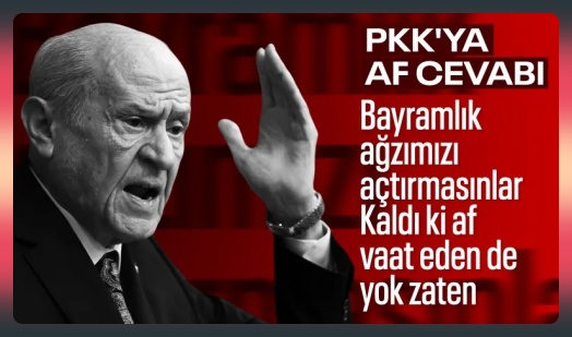 Milliyetçi Hareket Partisi (MHP) Genel Başkanı Devlet Bahçeli, Türkgün Gazetesi’ne verdiği röportajda “Terörsüz Türkiye” sürecine ilişkin değerlendirmelerde bulundu ve süreci sabote etmeye yönelik açıklamalara sert tepki gösterdi. Bahçeli, herhangi bir af düzenlemesinin gündemde olmadığını vurgulayarak, “Bayramlık ağzımızı açtırmasınlar, herkes haddini hududunu bilsin.” ifadelerini kullandı.